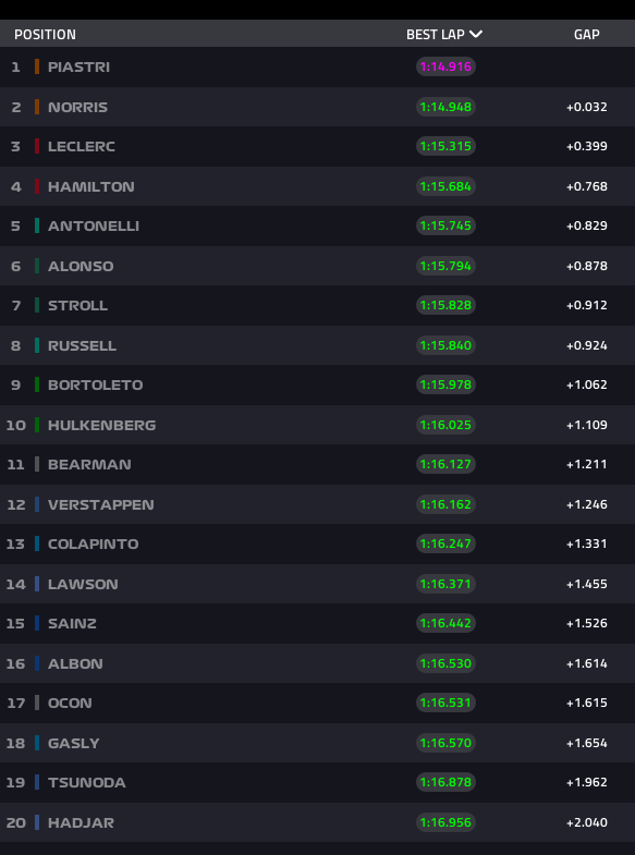Isack Hadjar apanhou um susto na penúltima curva e fez um pião, antes de Norris tentar mais uma volta rápida sem ritmo para suplantar o seu registo anterior. Até ao fim da sessão não houve mais nenhum motivo de interesse. Piastri terminou com o melhor tempo seguido de Norris, Leclerc, Hamilton, Antonelli, Alonso, Stroll, Russell, Bortoleto e Hulkenberg.