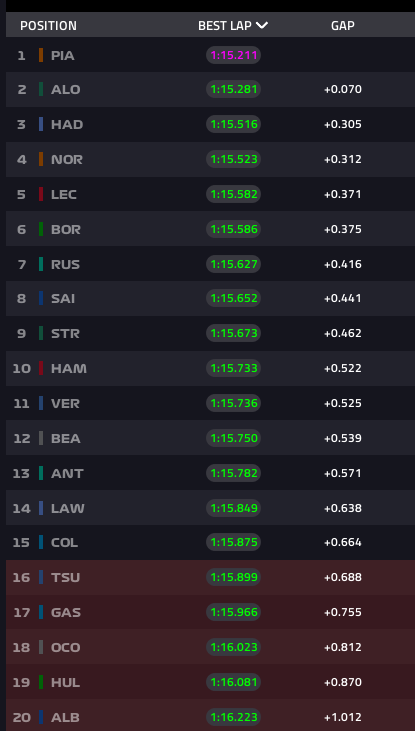 O top 10 era Piastri, Alonso, Hadjar, Norris, Leclerc, Bortoleto, Russell, Sainz, Stroll e Hamilton. Verstappen era 11º.
