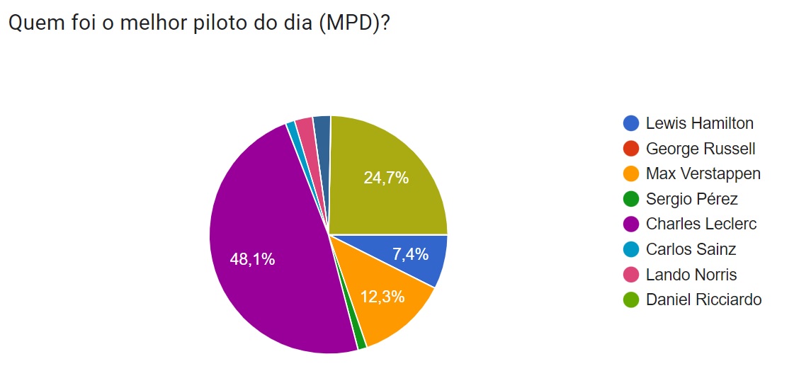 Na última votação do ano para o Melhor Piloto do Dia, os leitores do AutoSport deram preferência ao vice-campeão de Fórmula 1 de 2022 Charles Leclerc (48,1%). O piloto monegasco conseguiu bater Sergio Pérez em pista na luta que durou até à última volta da corrida e por isso terá merecido a maioria dos votos dos nossos leitores. O segundo piloto com mais votos foi Sebastian Vettel (24,7%), um dos pilotos mais ativos na corrida, mas que não foi beneficiado pela estratégia da equipa. O vencedor da corrida e bicampeão mundial Max Verstappen foi o terceiro piloto mais votado (12,3%).