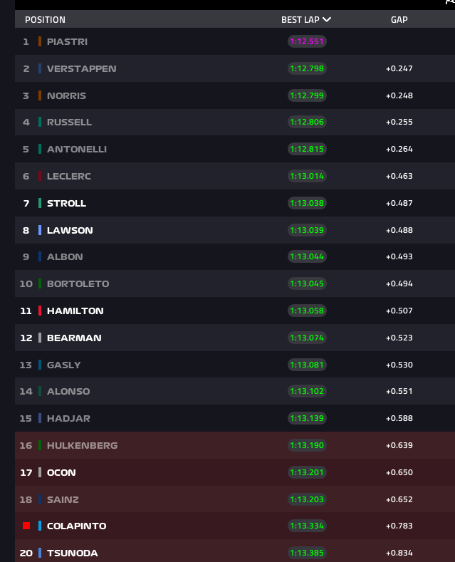 A meio desta sessão, a ordem era Piastri, Verstappen, Norris, Russell, Leclerc, Albon, Alonso, Hamilton, Hadjar e Bearman. Na zona de eliminação estavam Hulkenberg, Ocon, Sainz, Tsunoda e Bortoleto.