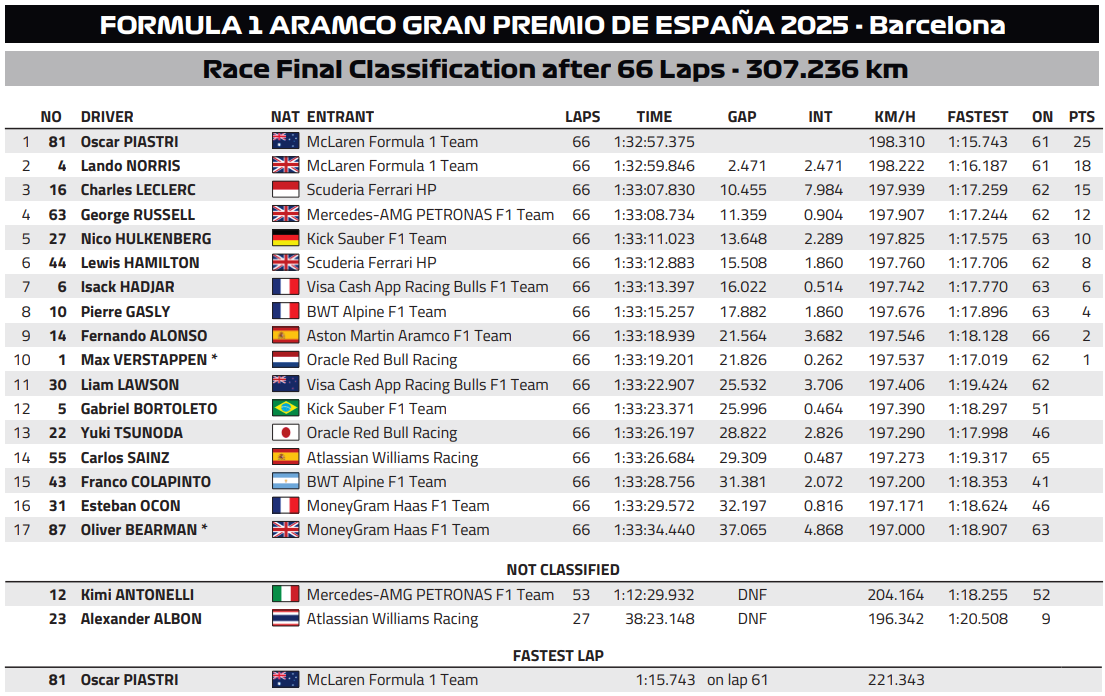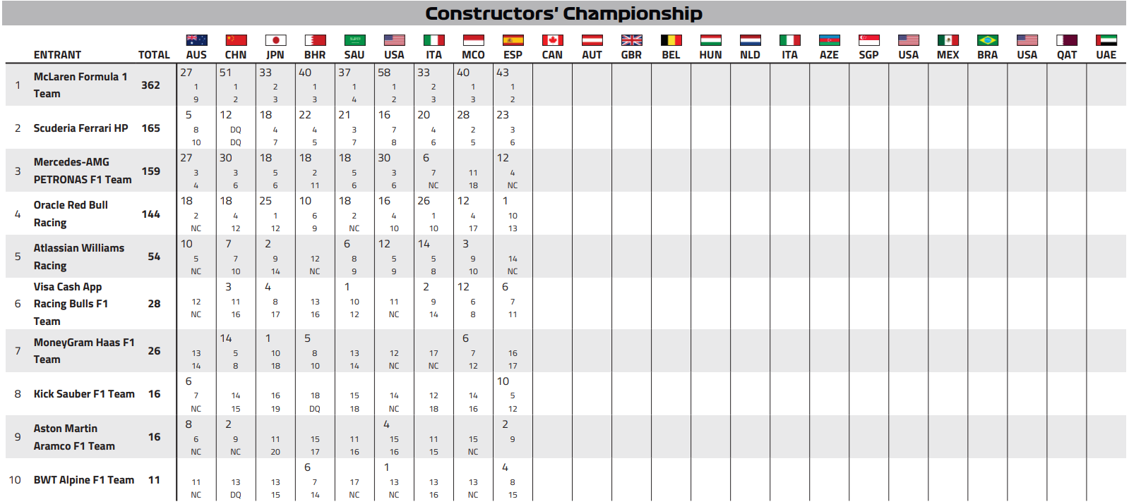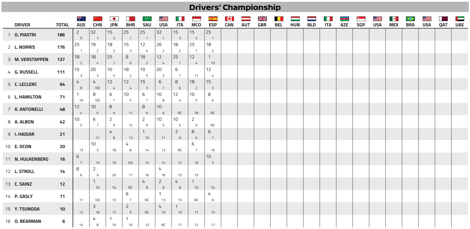 Creio que Max Verstappen começa a ficar de fora da luta pelo título de pilotos ou seja Oscar Piastri para já apresenta-se como favorito.No mundial de construtores só um golpe de teatro do tamanho do mundo impedirá o título da McLaren.