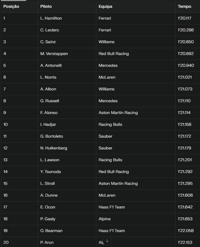 Nos minutos finais, a emoção atingiu o pico. Lewis Hamilton, com pneus macios que não eram novos, surpreendeu ao registar o melhor tempo da sessão: 1m20,117s. O seu desempenho fez a multidão vibrar e colocou o Ferrari na frente da tabela de tempos.