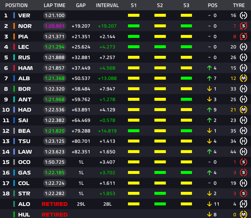 Entretanto, as voltas iniciais foram palco de intensas batalhas, com Piastri e Leclerc a trocarem de posições e Hamilton a escalar o pelotão, subindo para o oitavo lugar. À quarta volta, Verstappen, beneficiando do DRS, lançou um ataque decisivo sobre Norris na Curva 1, assumindo a liderança da corrida, posição que não mais largaria.