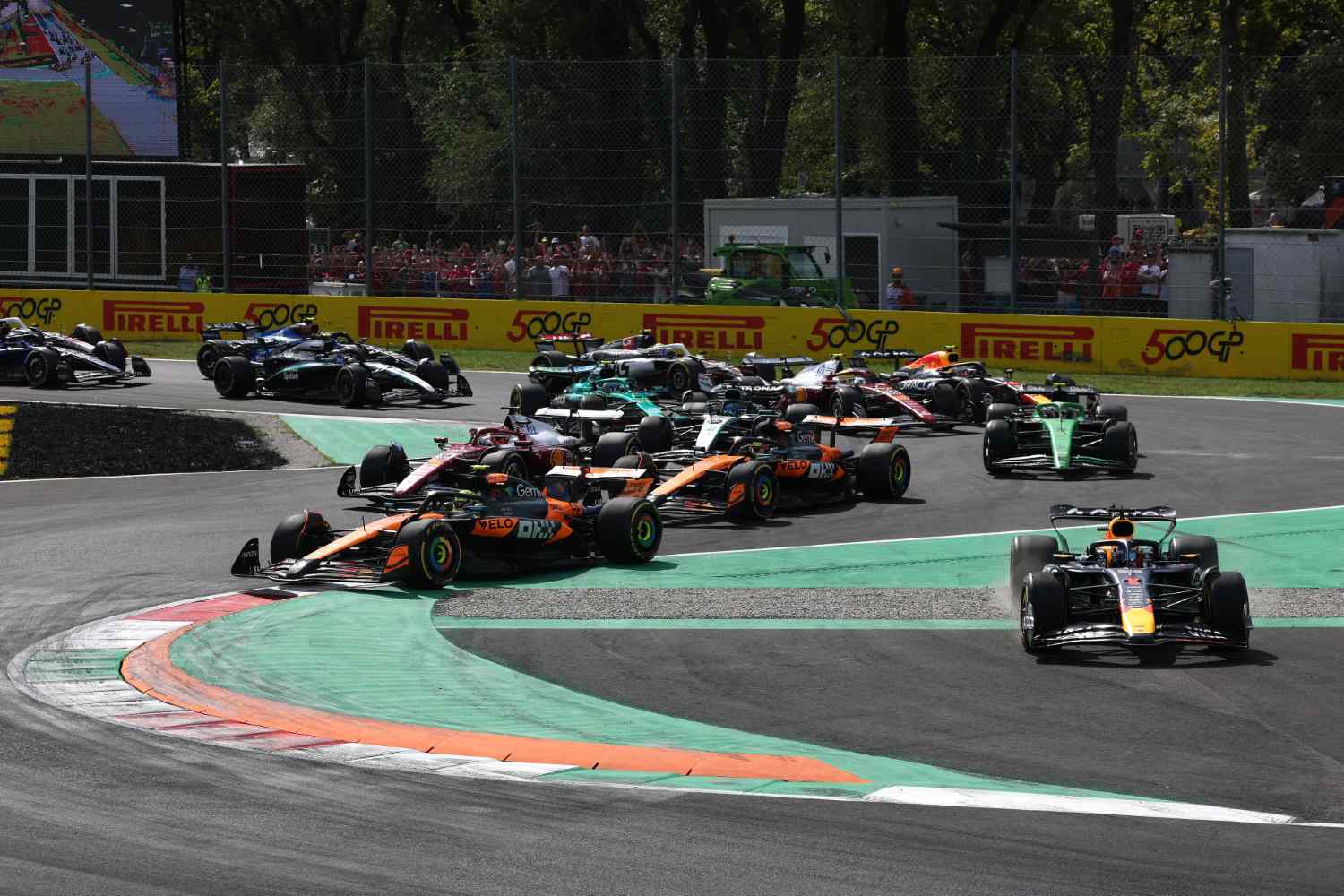 A jornada de Monza começou antes mesmo das luzes se apagarem, com Nico Hülkenberg, da Kick Sauber, a ser forçado a abandonar devido a um problema no seu monolugar. No arranque, Max Verstappen teve uma partida limpa, enquanto Lando Norris, da McLaren, foi forçado a ir para a relva na Curva 1, mas conseguiu manter o controlo. Verstappen, contudo, cortou a chicane, o que o levou a ter de devolver a posição a Norris na segunda volta, que assim recuperou a liderança.