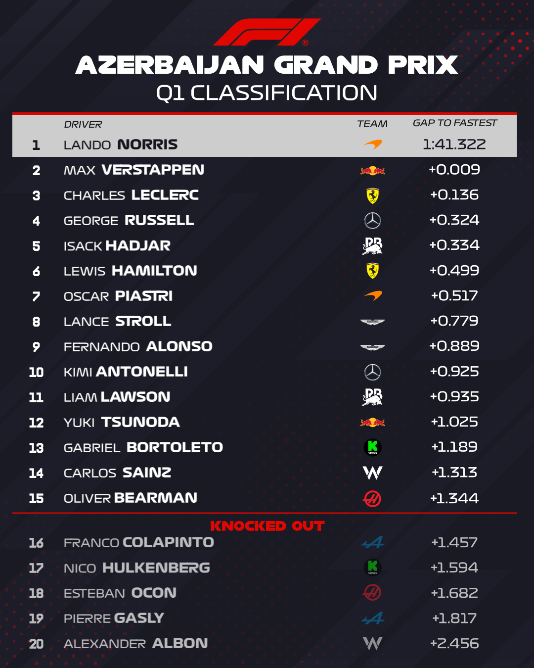 Lando Norris ainda tocou nas proteções da pista, não conseguiu o tempo que desejava e ficou a 0,6 seg. do tempo de Sainz. Verstappen conseguiu um tempo melhor e agarrou a pole para o GP do Azerbaijão. Sainz ficou com o segundo tempo e Liam Lawson fechou o top 3.