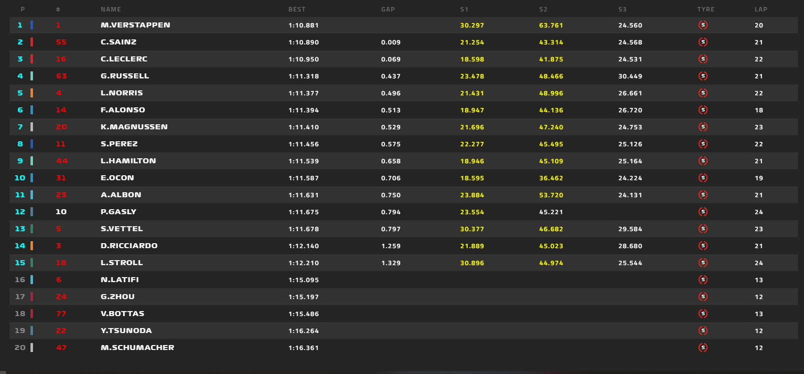 Max Verstappen (macios usados) foi o primeiro a entrar no segundo 11, mas foi destronado por Lando Norris (macios novos), com Pierre Gasly a fazer o terceiro tempo, com Fernando Alonso e Alex Albon a completar o top 5 nos primeiros minutos. Fernando Alonso passou para a frente do pelotão, tirando 0.177 seg. ao tempo de Lando Norris (1:11.571). Verstappen tratou de tirar 0.076 ao tempo de Alonso, numa altura em que a chuva parecia querer voltar a ser destaque. Os pilotos da Mercedes entraram no top 5, com Charles Leclerc como companhia.