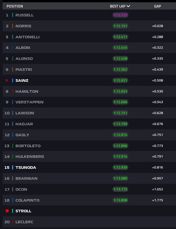 A sessão chegou ao fim e Russell ficou com o melhor tempo, seguido de Norris, Antonelli, Albon, Alonso, Piastri, Sainz, Hamilton, Verstappen e Lawson.