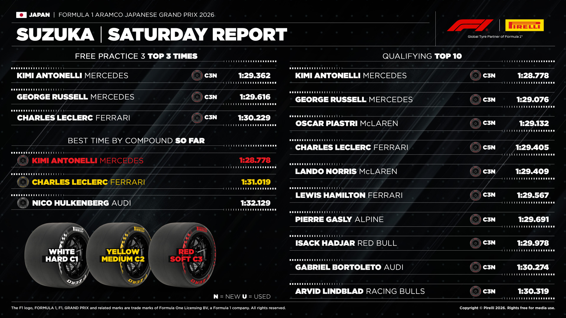 Os dados analisados pela fornecedora de pneus refletem aquilo que já tinha sido observado em pista, com a Mercedes a destacar-se no TL3, onde Antonelli liderou à frente de George Russell. Na qualificação, o italiano confirmou o favoritismo com a melhor volta em 1:28.778. A evolução da pista ao longo do fim de semana permitiu melhorias nos tempos, com a qualificação a registar voltas mais rápidas face ao dia anterior, em linha com as simulações da Pirelli.
