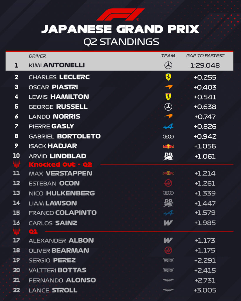 No final da Q2, foram eliminados Max Verstappen, Esteban Ocon, Nico Hülkenberg, Liam Lawson, Franco Colapinto e Carlos Sainz. Kimi Antonelli regressou ao topo e garantiu o melhor tempo (1:29.048), seguido de Charles Leclerc, Oscar Piastri, Lewis Hamilton e George Russell. Lando Norris, Pierre Gasly, Gabriel Bortoleto, Isack Hadjar e Arvid Lindblad passaram à Q3.