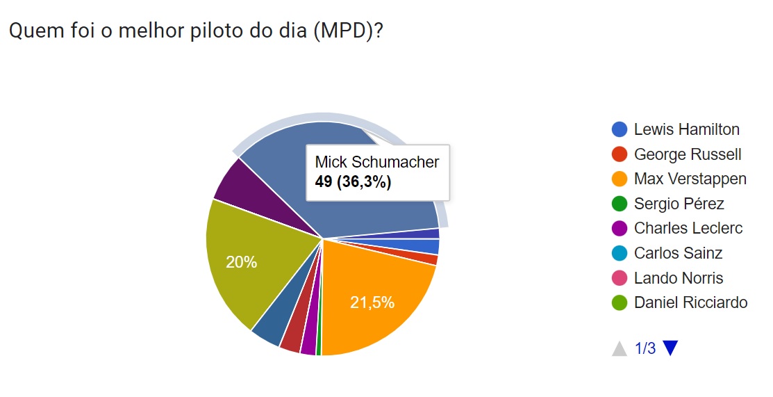 O resultado da votação deu-nos um vencedor surpreendente. Mick Schumacher recebeu 36,3% dos votos, seguido de Max Verstappen (21,5%) e Sebastian Vettel (20%). Foram os votos dos leitores do AutoSport que surpreendentemente votaram na sua maioria no penúltimo classificado do Grande Prémio do Japão, que segundo o seu tio, Ralf Schumacher foi traído pela estratégia da Haas.