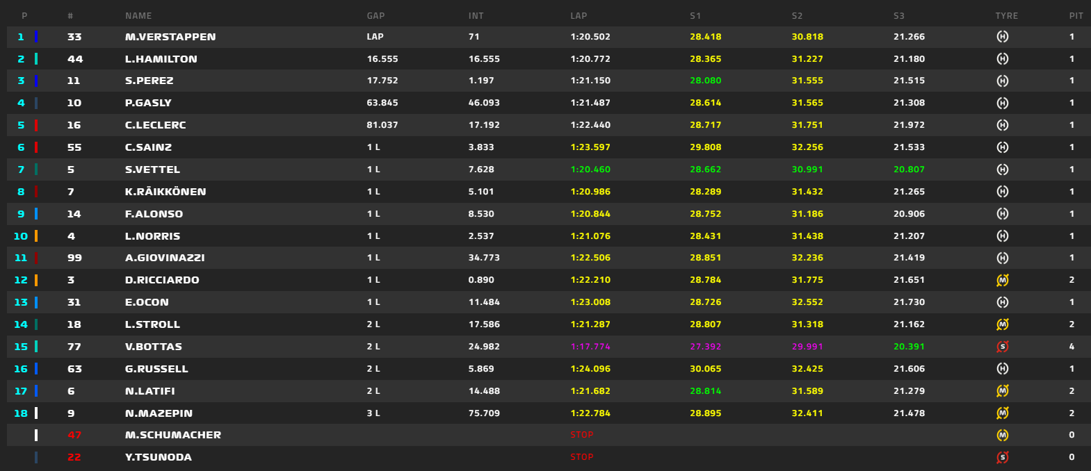 A nulidade do dia foi Bottas, quer lutar pelo título e nem tapa o exterior por onde vem Max? Ok lol, assim vais longe. Depois ficou com a corrida estragada e ainda por cima, fica atrás de quem a estragou toda a corrida (não percebi como Ricciardo não levou uma penalidade de 5 segundos por provocar um toque e estragar a corrida de Bottas, mas pronto, aposto que aqui ninguém se indigna, imaginem se tivesse sido Max a levar com aquele toque, ui ui, era só drama).