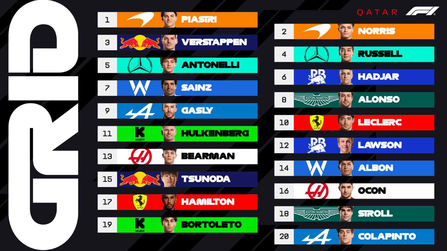 Com Oscar Piastri (McLaren F1), Lando Norris (McLaren F1), Max Verstappen (Red Bull) e George Russell (Mercedes) — os quatro primeiros classificados no campeonato — a ocupar as duas primeiras linhas da grelha, e sabendo que a pista de Lusail é notoriamente desafiante para ultrapassagens, a corrida poderá ser decidida, ou pelo menos significativamente influenciada, por quem liderar após a Curva 1.