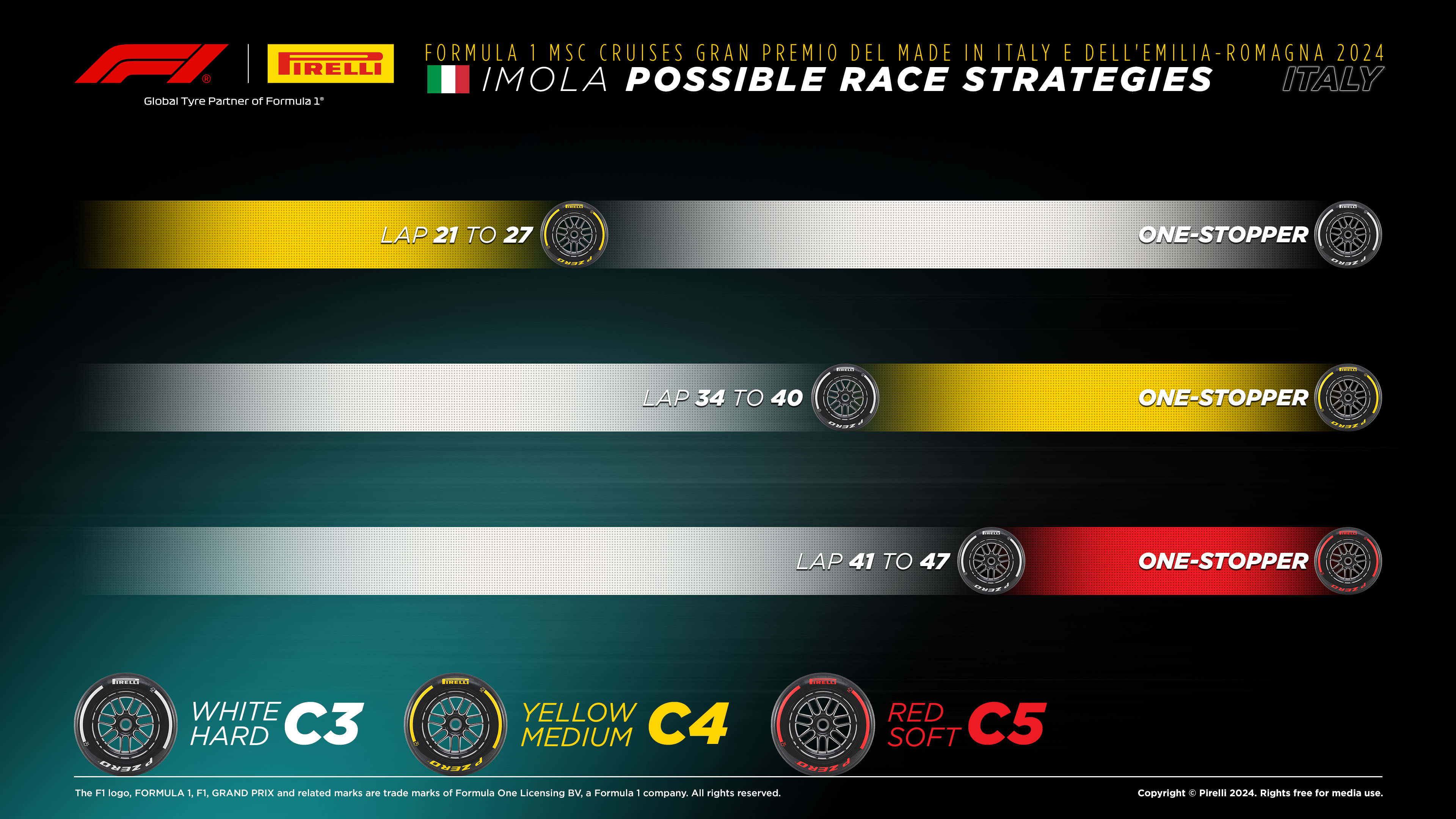 O traçado estreito e acidentado de Imola limita as oportunidades de ultrapassagem, tornando a estratégia crucial. A estratégia de uma paragem para troca de pneus prevista, a opção mais rápida que a Pirelli identificou, poderá envolver o início de corrida com o composto médio e mudar para o duro entre as voltas 21 e 27. Esta abordagem é considerada cerca de 15 segundos mais rápida do que uma estratégia de duas paragens, segundo o responsável da Pirelli Motorsport, Mario Isola.