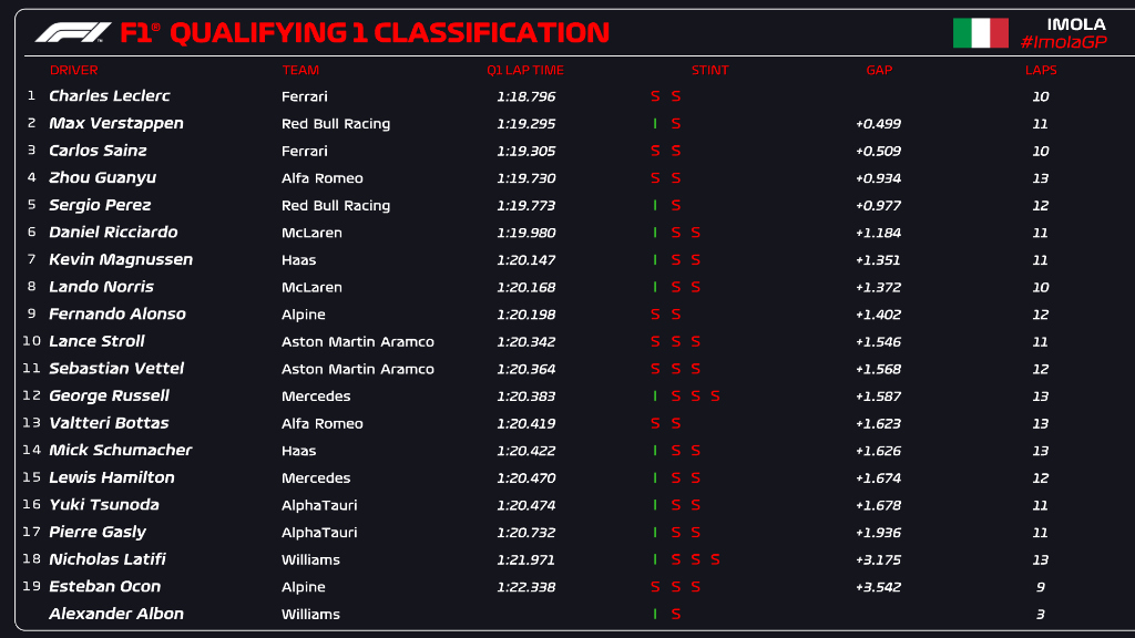 Nos minutos finais, Lewis Hamilton teve de parar para trocar de pneus para um conjunto novo de pneus, mas os dois pilotos da Mercedes sentiram algumas dificuldades para passaram para a Q2. Conseguiram-no e colocaram em zona de eliminação Pierre Gasly e Yuki Tsunoda. Para surpresa de todos, os dois AlphaTauri não passaram, assim como Esteban Ocon.