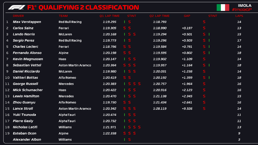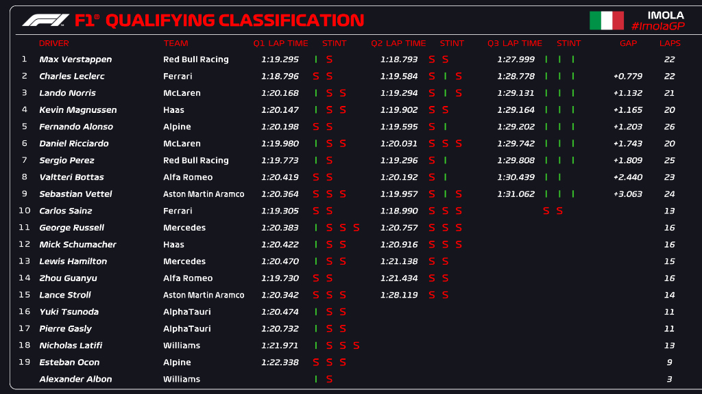 Assim, mesmo com a saída de pista, Lando Norris manteve o terceiro tempo mais rápido, atrás de Max Verstappen e Charles Leclerc. Kevin Magnussen terminou com o quarto melhor tempo, seguido de Fernando Alonso, Daniel Ricciardo, Sergio Pérez, Valtteri Bottas, Sebastian Vettel e Carlos Sainz, que não registou nenhum tempo na Q3.