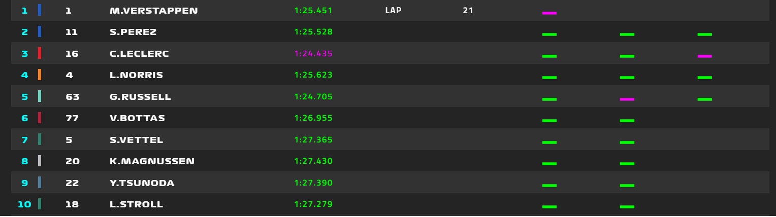 Os líderes pararam e Max Verstappen continua a liderar, mas Sergio Pérez teve de se esforçar para conseguir recuperar o segunda posição a Charles Leclerc.
