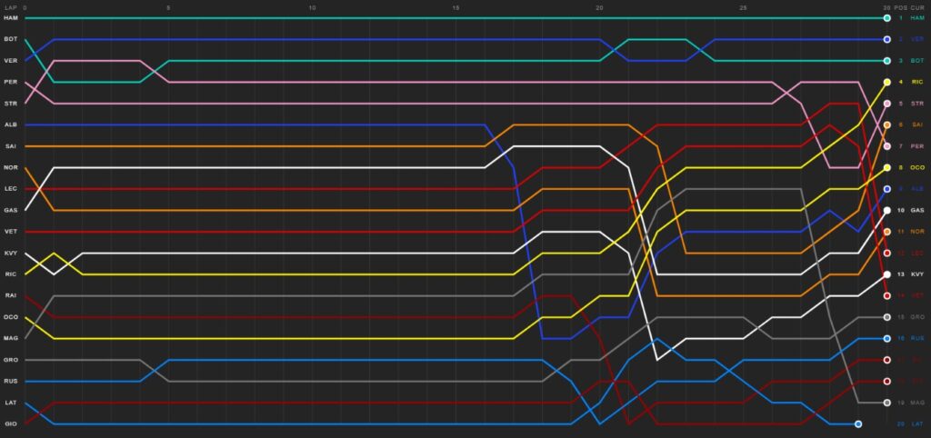 Sergio Pérez e Lance Stroll pararam mais tarde, levando os pneus macios por 30 voltas, para depois colocarem os macios. Quem aproveitou a paragem dos Racing Point foi Carlos Sainz, que agora está em 6º lugar entre os RP.