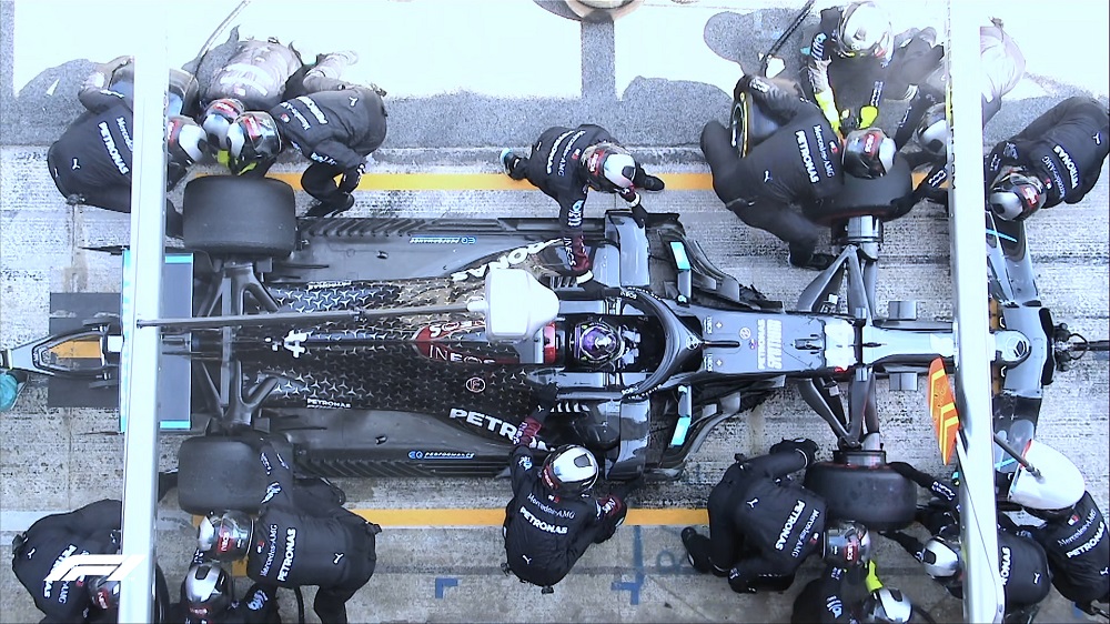 Max Verstappen foi o primeiro dos três da frente a parar. O holandês ‘calçou’ os pneus médios, enquanto Lewis Hamilton parou umas voltas a seguir, colocando também os médios, tal como Valtteri Bottas. Mas, na frente, tudo igual, com Lewis Hamilton a liderar com cerca de 3.5s sobre Max Verstappen. Valtteri Bottas segue a cerca de 3s de Verstappen e a 5s de Hamilton.
