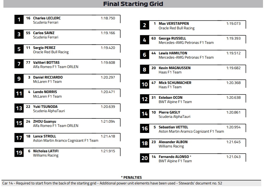 Charles Leclerc arranca de novo da pole position com Max Verstappen ao seu lado. Depois dos principais protagonistas, seguem-se Carlos Sainz e George Russell, que acredita poder disputar um lugar no pódio.