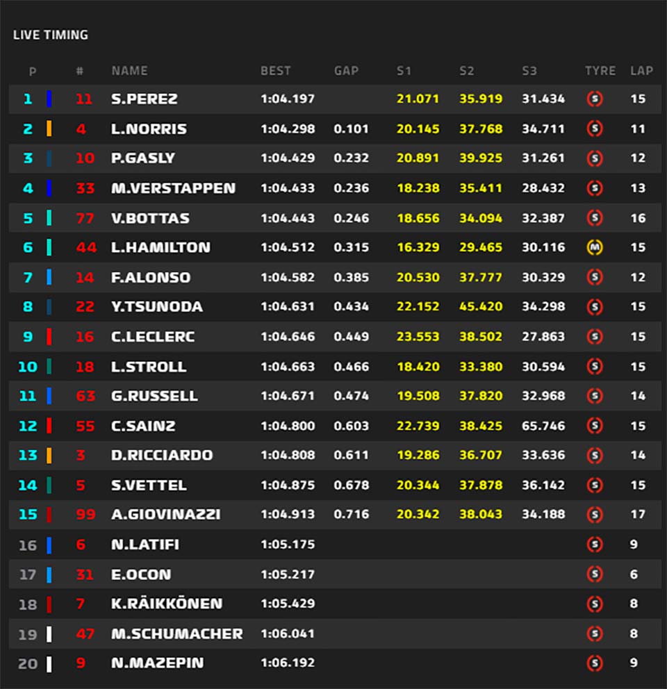 Apesar de ter sido eliminado na Q2, George Russell (Williams-Mercedes FW43B) foi mais rápido que Carlos Sainz Jr. (Ferrari SF21), Daniel Ricciardo (McLaren-Mercedes MCL35M), Sebastian Vettel (Aston Martin-Mercedes AMR21) e Antonio Giovinazzi (Alfa Romeo Racing-Ferrari C41).