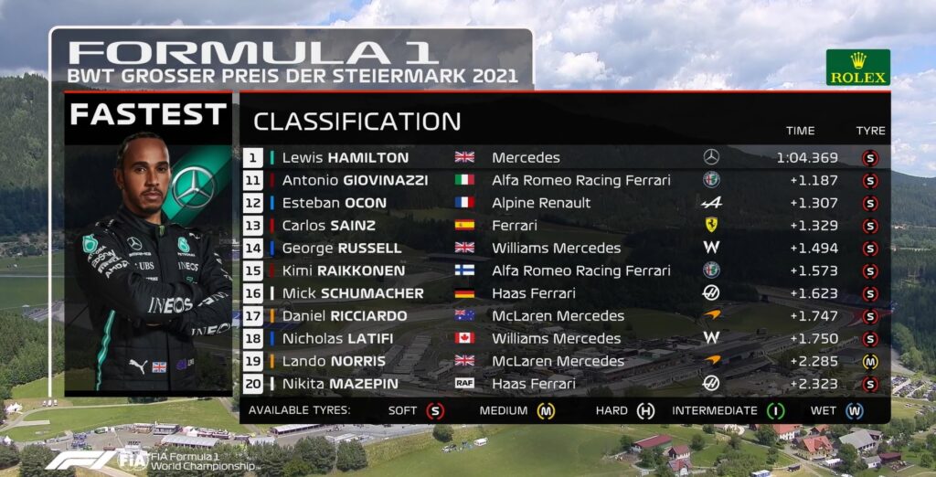 Depois da passagem da meia hora de treino, Verstappen conseguiu um tempo canhão no traçado austríaco, tendo completado a sua volta em 1:04.971s, no entanto à entrada para os últimos 15 minutos, primeiro Bottas e depois Hamilton, bateram o tempo de Verstappen. Lewis Hamilton precisou de 1:04.369s para completar a volta.