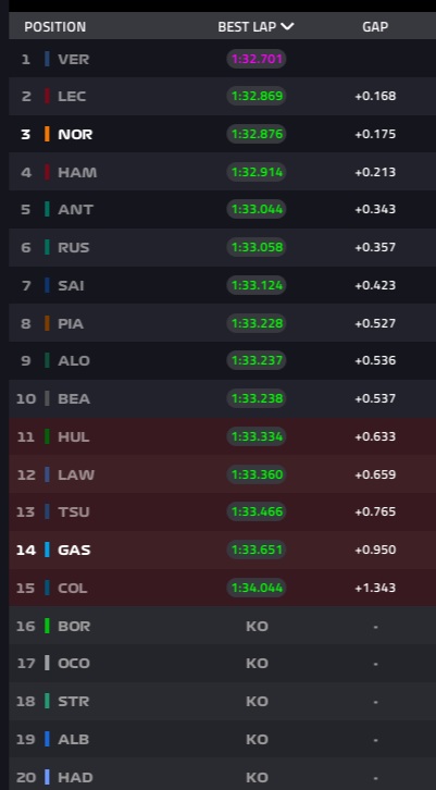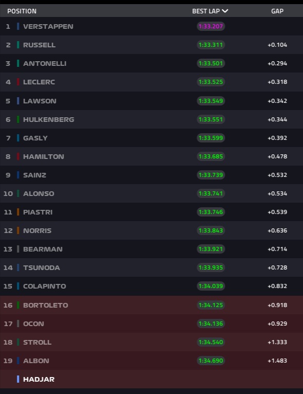 Na zona de eliminação ficavam Gabriel Bortoleto, Esteban Ocon, Lance Stroll e Alex Albon (volta apagada por limites de pista), sem contar com Hadjar.
