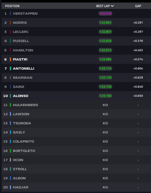 No entanto, a Red Bull voltou a errar tal como tinha feito ontem com Yuki Tsunoda e Verstappen, o último a sair da via das boxes, não chegou a tempo para iniciar a sua volta rápida antes da bandeira de xadrez ser mostrada. Mas ainda assim, ninguém melhorou o tempo de Verstappen e ficou com a pole, seguido de Lando Norris e Charles Leclerc e George Russell. Hamilton, Piastri (!), Antonelli, Bearman, Sainz e Alonso completaram o top 10 nesta qualificação.