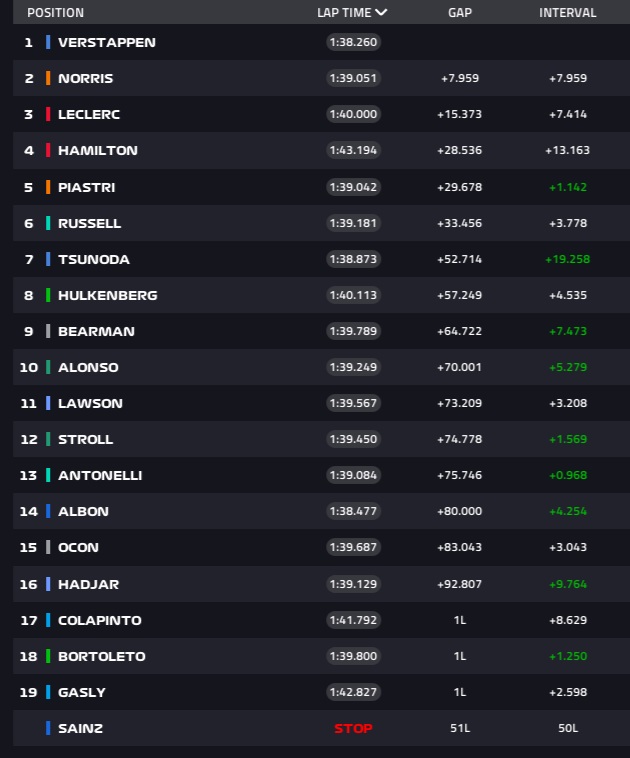 A ordem no final da primeira volta era Verstappen, Leclerc, Norris, Hamilton, Piastri, Russell, Antonelli, Bearman, Sainz e Tsunoda. Se na frente da corrida, Verstappen já tinha uma vantagem considerável para Leclerc, na luta pelos últimos pontos, Bearman caiu para o 10º, ultrapassado por Sainz e Tsunoda numa luta animada.