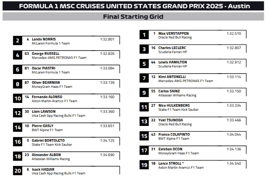 As posições mantiveram-se até ao fim e Verstappen conseguiu uma excelente vitória, seguido de Norris e Leclerc. O campeonato ganhou ainda mais vida. Verstappen está imparável e leva cinco pódios consecutivos, três dos quais vitórias. Com 33 pontos conquistados em Austin, está agora a 40 pontos de Piastri e a 26 pontos de Norris. Tudo em aberto quando faltam cinco corridas para o fim da temporada 2025.