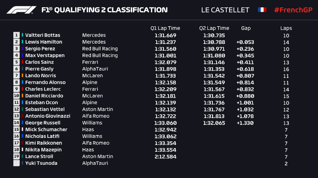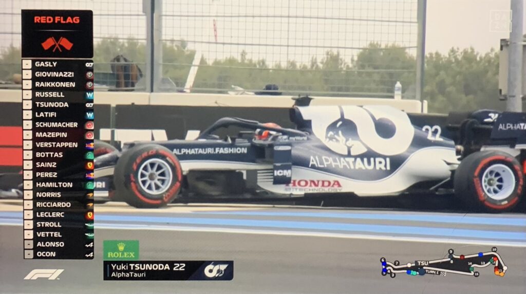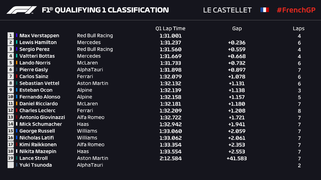 As últimas voltas lançadas ao traçado de Paul Ricard foram interrompidas por Mick Schumacher que teve uma saída de pista o que levou ao final prematuro da sessão, deixando fora da Q2 Latifi, Raikkonen, Mazepin e Stroll. Schumacher conseguiu uma vaga na Q2 mas os danos no seu carro impossibilitaram a presença na segunda parte da sessão.