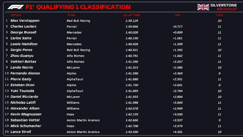 Enquanto o piloto neerlandês da Red Bull estabelecia um novo melhor tempo (1:39.129s), Alexander Albon, Kevin Magnussen, Sebastian Vettel, Mick Schumacher e Lance Stroll foram eliminados.