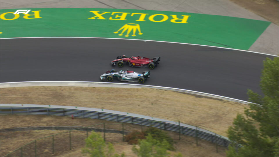 Na volta 27, Leclerc passou pelo ponto de deteção de DRS a menos de 1 segundo de George Russell e na volta seguinte, entre a curva 1 e 2, o monegasco atacou a liderança do britânico, mas o piloto da Mercedes defendeu-se bem e manteve o posto. A luta entre os dois da frente do pelotão durou várias voltas, mas na volta 31 o monegasco atrasou ao máximo a travagem para a curva 1 e ultrapassou pela trajetória exterior Russell. Ainda com DRS entre a curva 1 e a curva 2, o piloto da Ferrari conseguiu escapar à resposta de Russell.