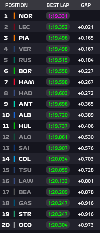 Lando Norris (McLaren) registou 1m19.331s, com Charles Leclerc (Ferrari) apenas a 0.021s enquanto Oscar Piastri (McLaren) foi terceiro a 0.165s. A confirmar o bom momento, Max Verstappen (Red Bull) foi quarto a 0.167s na frente de George Russell (Mercedes) com a grande surpresa da lista a ser o brasileiro Gabriel Bortoleto (Kick Sauber), a 0.227s da frente. Lewis Hamilton (Ferrari) foi sétimo com Isack Hadjar (Racing Bulls), Kimi Antonelli (Mercedes) e Alex Albon (Williams) a fecharem o top 10.