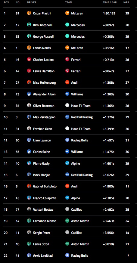 Nos primeiros minutos, os tempos começaram a cair. Piastri saltou para o topo com 1m31,495s, apenas 0,073s mais rápido do que Russell, ambos em médios, com Antonelli a seguir, Hamilton logo atrás e Lawson a completar o quinteto da frente. Norris e Pérez continuavam encostados nas boxes, Lindblad tinha feito apenas uma volta de instalação antes de estacionar o carro. Lá à frente, até a saída da via das boxes tinha drama: Albon foi largado para cima de Gasly, forçando o francês a reclamar pelo rádio enquanto o engenheiro se apressava a admitir o erro.