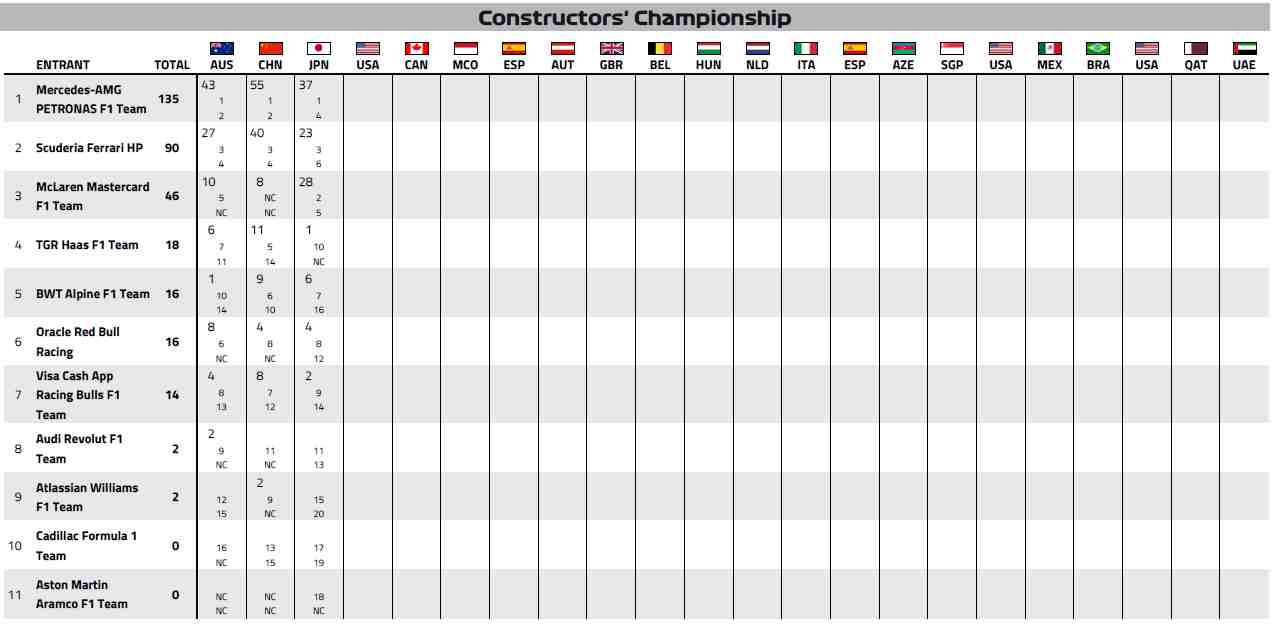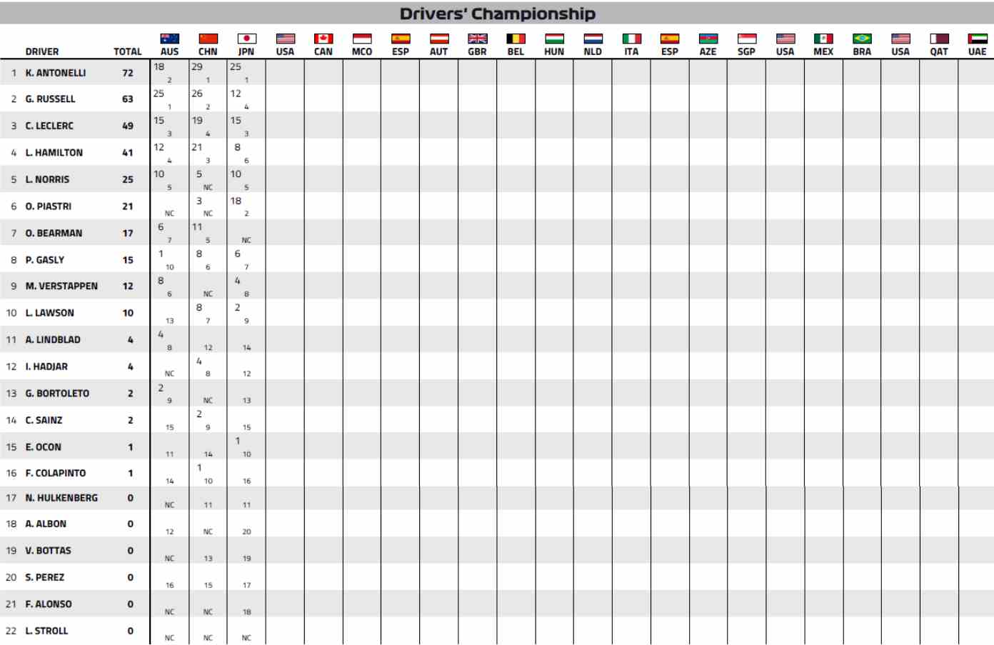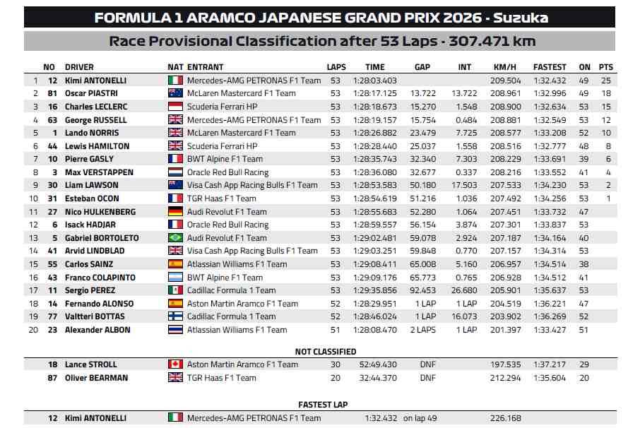 GP Japão F1: Resultados e classificações, Antonelli faz história
