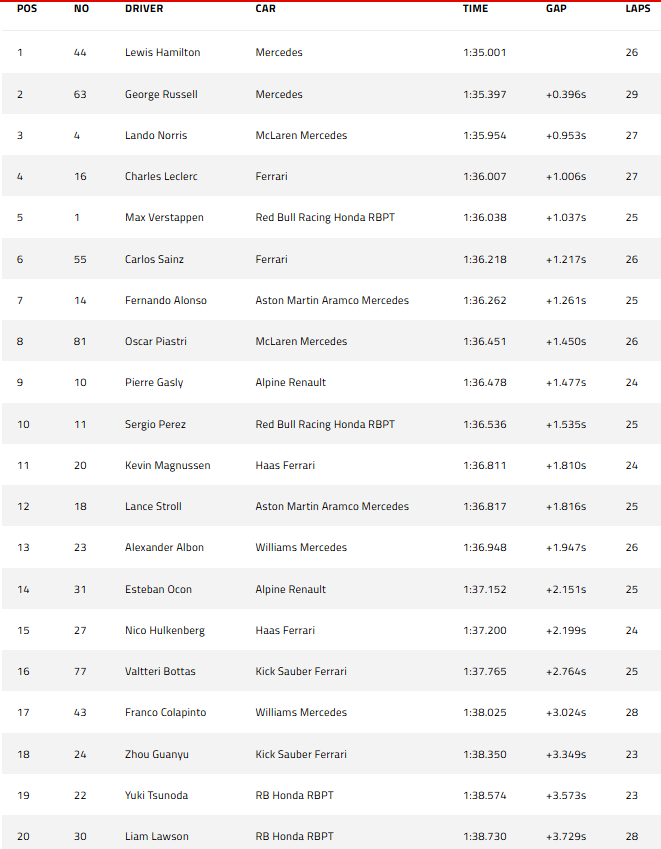 Desta forma, as Flechas de Prata terminaram a sessão com uma formação dominante de um par, seguida por Norris, Leclerc, Verstappen, Sainz e Fernando Alonso, que colocou o seu Aston Martin à frente de Piastri, Gasly e Sergio Perez, da Red Bull, nas últimas posições do top-10.