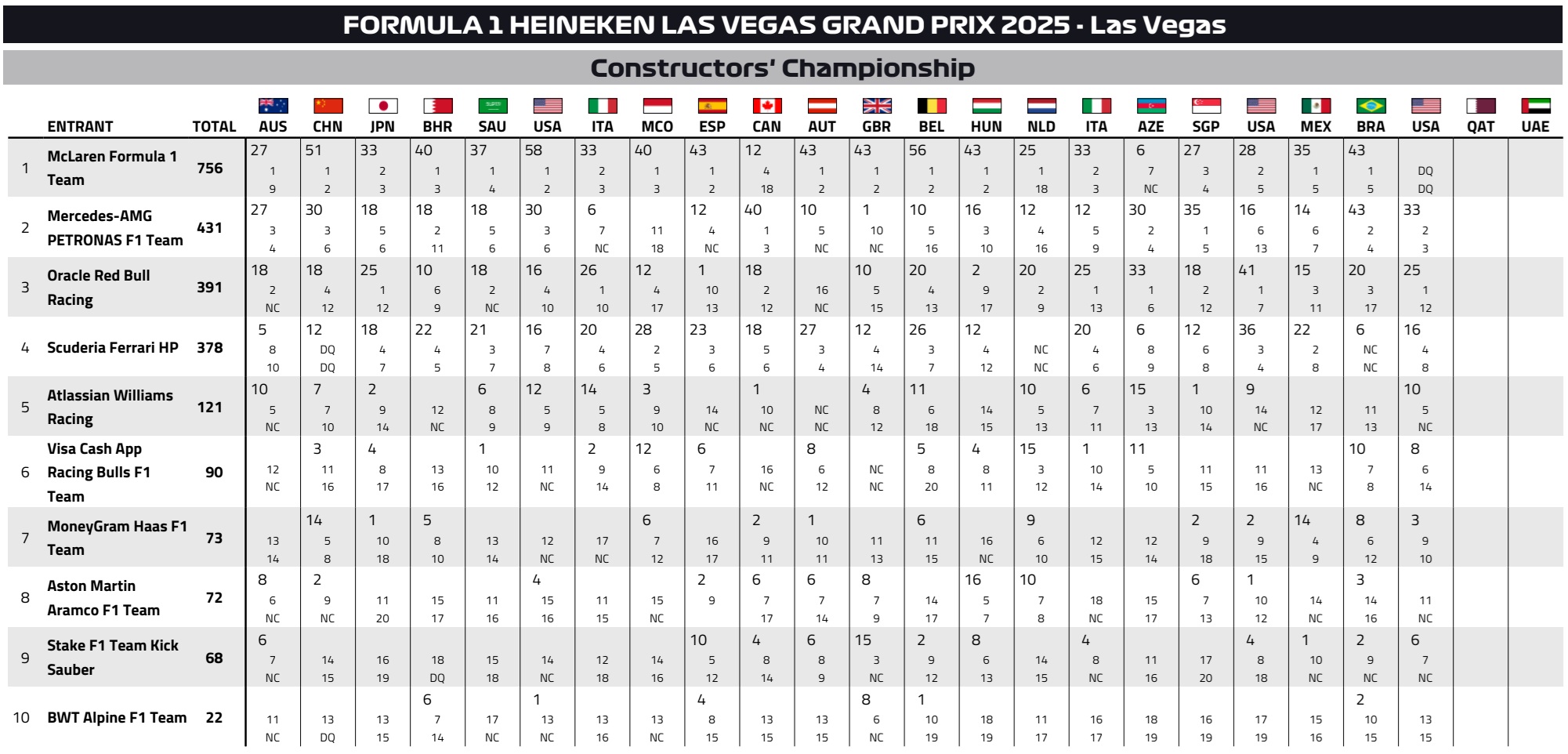 Depois de um dramático fim de semana em Las Vegas, a Red Bull foi a principal beneficiada com o triunfo de Max Verstappen e a dupla desclassificação da McLaren, com efeitos claros na classificação. As contas do título mantêm-se em aberto, apesar de Lando Norris ter ainda vantagem, mas a pressão vai subir muito.