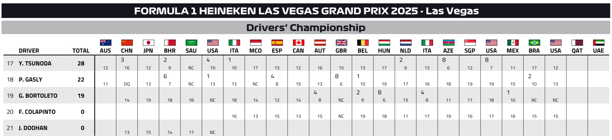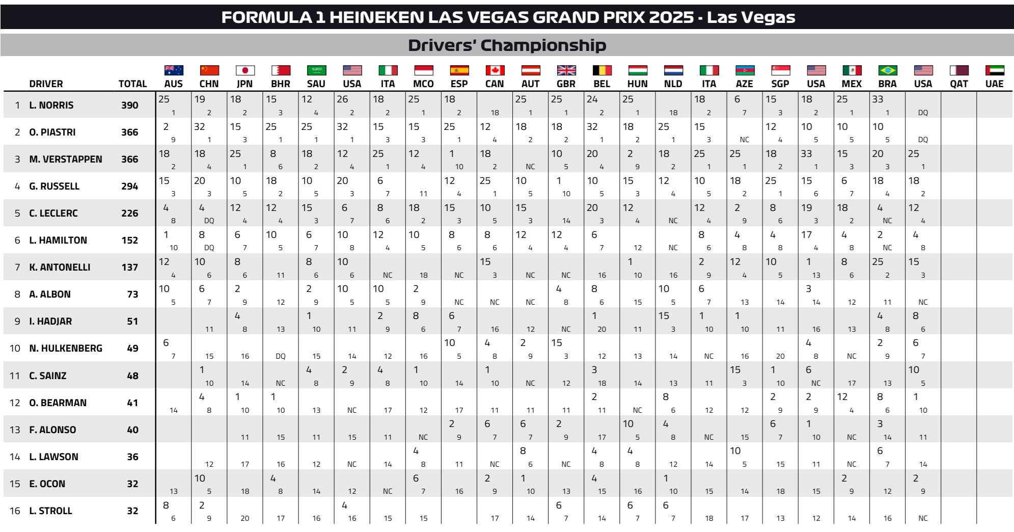 Fantástica luta pelo titulo como já não se via há alguns anos. Norris vai ter mesmo que provar que têm fibra de campeão para o ser no final destas duas corridas. As hipóteses ainda tendem para si, mas a pressão começa a ser enorme. No outro espectro, veradeiramente confrangedor a posição da AM racing que com um muito mau carro e com um piloto sem a mininima motivação (L.Stroll), e um grande piloto mas já em pré-reforma terá que pensar muito a sério/estratégicamente sobre o que fazer em 2026/2027. Por ultimo a certeza de que se a RB continuar assim, dificilmente será novamente campeã dos construtores, pois Max não pode fazer tudo sózinho, e a prestação do Yuki infelizmente mostra bem o abismo que separa os dois pilotos