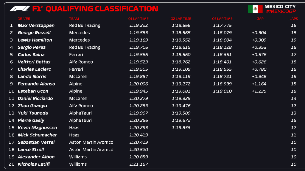 Max Verstappen conquistou a pole position para o Grande Prémio do México. O piloto neerlandês da Red Bull melhorou o seu primeiro tempo da Q3, registando 1:17.775s, com George Russell a 0.304s, que não conseguiu melhorar o seu primeiro tempo, depois de um pequeno erro no último setor. No terceiro posto da grelha de partida ficou Lewis Hamilton, que teve o seu primeiro tempo apagado por exceder os limites de pista, mas ficou à frente de Sergio Pérez.