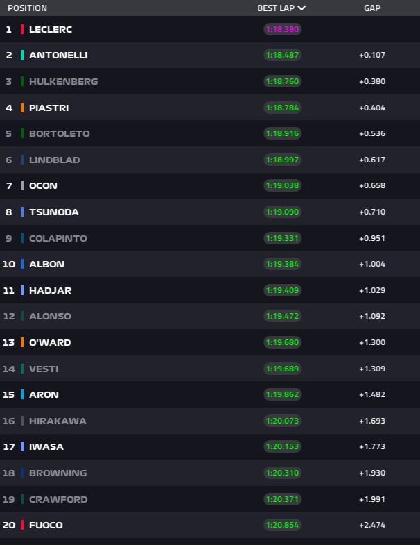 Ao fim de 15 minutos, Isack Hadjar liderava a tabela, já no segundo 20, seguido de Nico Hülkenberg e Esteban Ocon. Com uma sessão calma e a evoluir progressivamente, Hadjar manteve-se no topo da tabela, quando chegamos a meio da sessão. Foi nessa altura que Piastri “calçou” os pneus mais macios, e saltou para o topo da tabela, com o primeiro tempo com as borrachas marcados a vermelho.