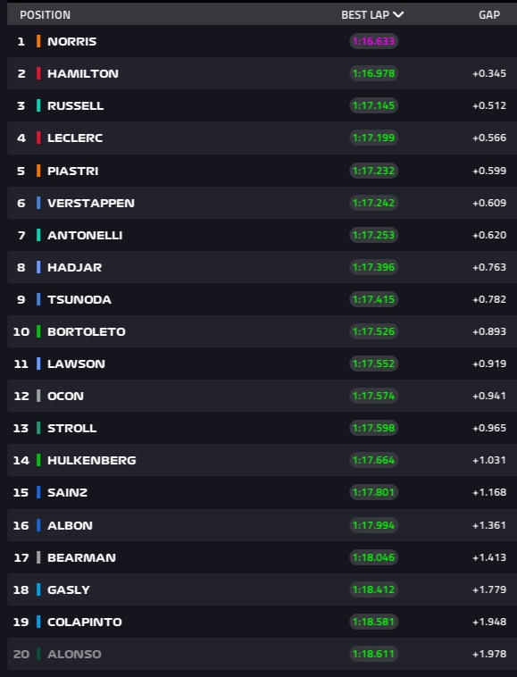 O piloto da McLaren foi claramente o mais rápido, com a concorrência a ficar a 0,345 seg. Lewis Hamilton foi o segundo mais rápido, seguido de George Russell. Charles Leclerc e Oscar Piastri completaram o top 5, à frente de Max Verstappen, que hoje se focou mais no ritmo de corrida, depois de ontem ter mostrado excelente ritmo em qualificação. Kimi Antonelli, Isack Hadjar, Yuki Tsunoda e e Gabriel Bortoleto completaram o top 10 nesta sessão.