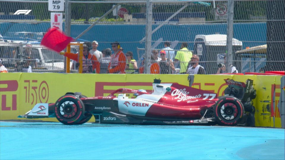 Valtteri Bottas tinha rodado apenas 13 voltas no primeiro treino livre quando perdeu controlo do Alfa Romeo C42 na curva 7 do Autódromo Internacional de Miami e bateu nas proteções do traçado. Os danos sofridos na traseira do monolugar, incluindo um componente da unidade motriz, foram demasiado grandes para a equipa reparar a tempo do segundo treino.