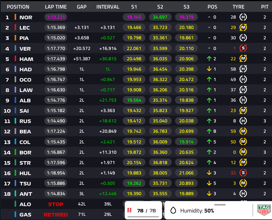 Hamilton faz a sua segunda paragem para a Ferrari na volta 57, na volta 60 Verstappen estava a atrasar Norris e Leclerc, não só na esperança de que eles tropeçassem um no outro ou de um Safety Car. O que sucedeu foi Piastri juntar-se a ele.