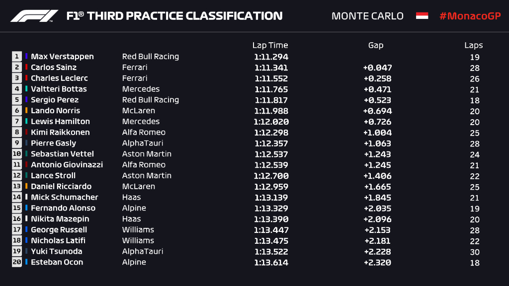 Verstappen conseguiu voltar ao topo da tabela com cinco minutos para o fim da sessão, com o neerlandês a usar pneus novos enquanto Sainz conseguia fazer um tempo equivalente com pneus usados.