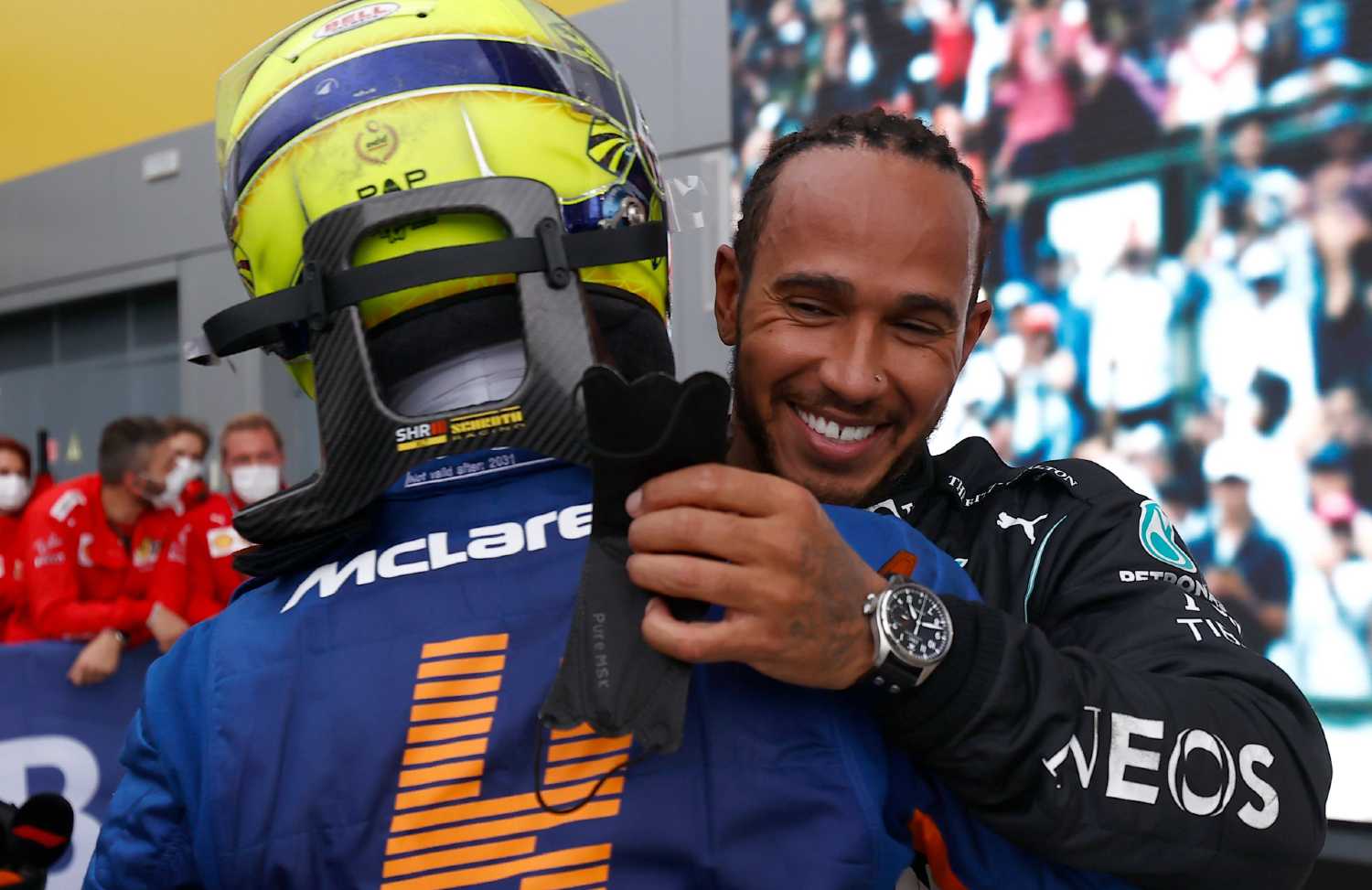 Na corrida o engenheiro perguntou a primeira vez se queria intermédios, ele disse que não estava assim tão mau. Na segunda vez, quando já estavam todos a mudar para intermédios, o engenheiro voltou a perguntar se queria intermédios, ele disse “não!” e ficou fora. A decisão foi dele. O próprio Hamilton na primeira vez que lhe disseram para entrar na pit não entrou, depois na segundo vez entrou, visto que no meio da pista já só fazia patinagem. No final foi falta de experiência de Norris e a Mclaren não ser mais “mandona”.