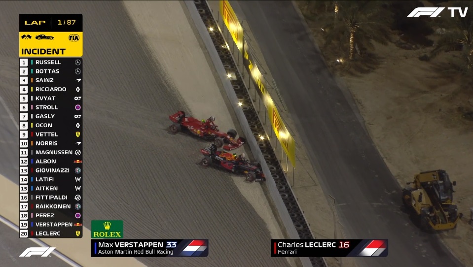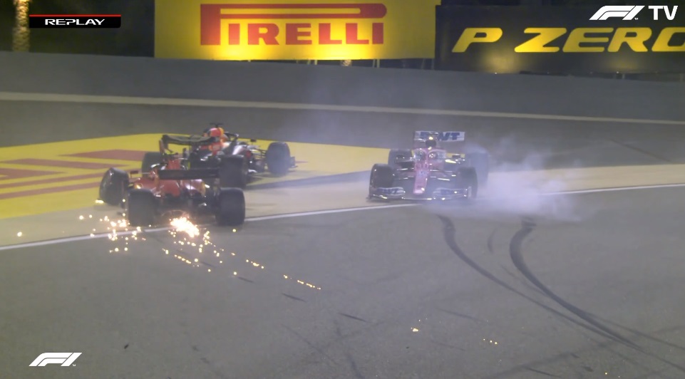 Max Verstappen e Charles Leclerc são as primeiras baixas do Grande Prémio do Sakhir. O piloto da Red Bull Racing e da Ferrari ficaram no muro da curva 4. Leclerc tocou em Sergio Pérez, deixando o piloto da Racing Point ‘virado’ ao contrário. Já Max Verstappen, ao tentar escapar do pião de Pérez, acabou no muro, ao lado de Leclerc. O Safety-Car está em pista, com George Russell na liderança do Grande Prémio, após um excelente arranque.