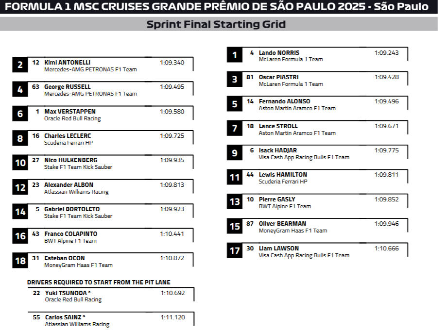 Depois da chuva, a meteorologia ajudou à festa em Interlagos, com a chuva a parar o tempo suficiente para permitir que o asfalto da pista de São Paulo começasse a secar, para o arranque da corrida Sprint, com 24 voltas.