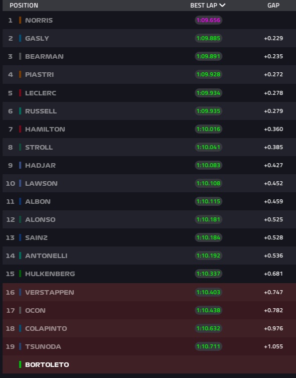 A seis minutos do fim da sessão, estavam na zona de eliminação Max Verstappen, Franco Colapinto, Esteban Ocon, Yuki Tsunoda e Gabriel Bortoleto, que ainda esperava pelo seu carro.