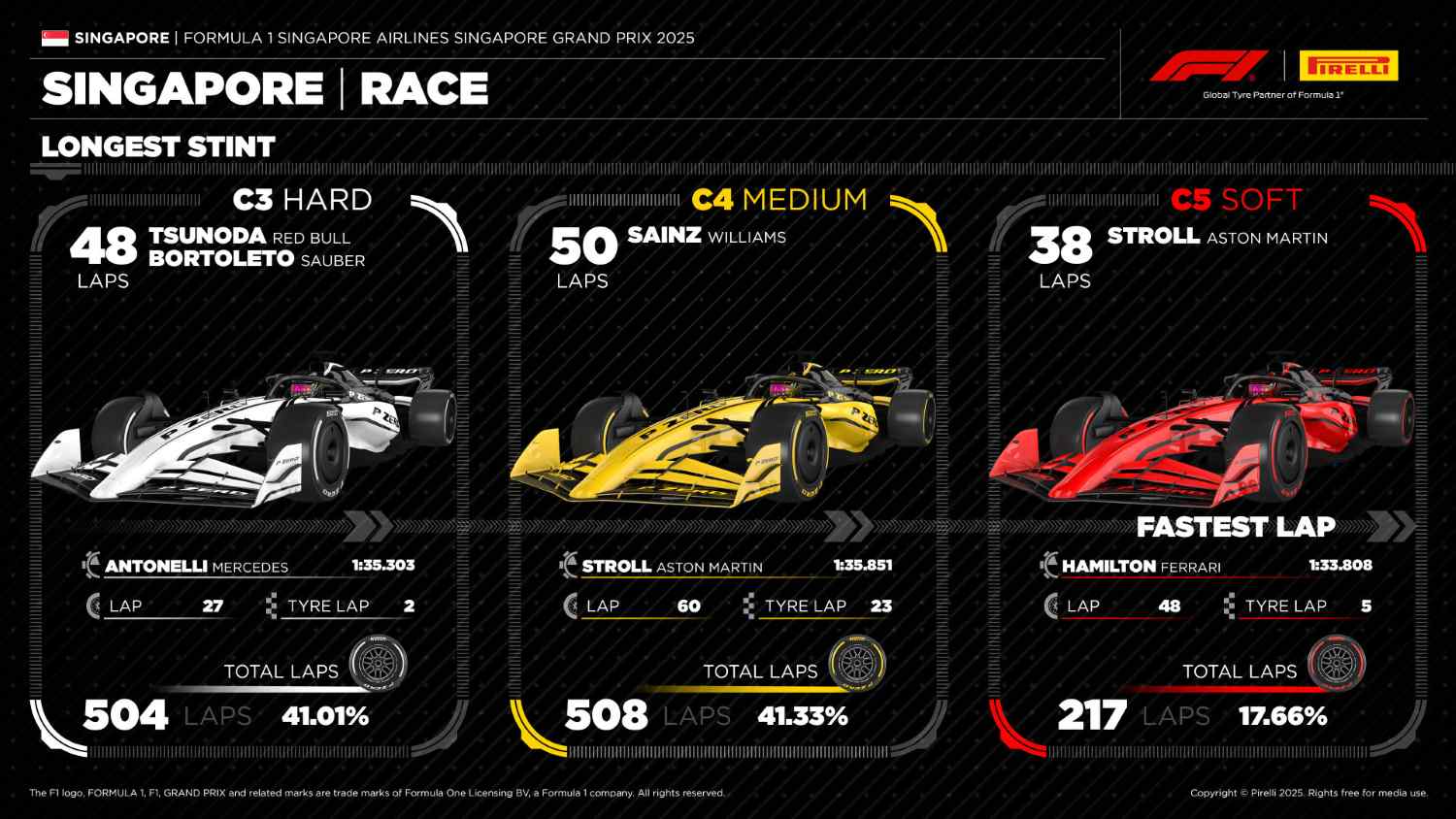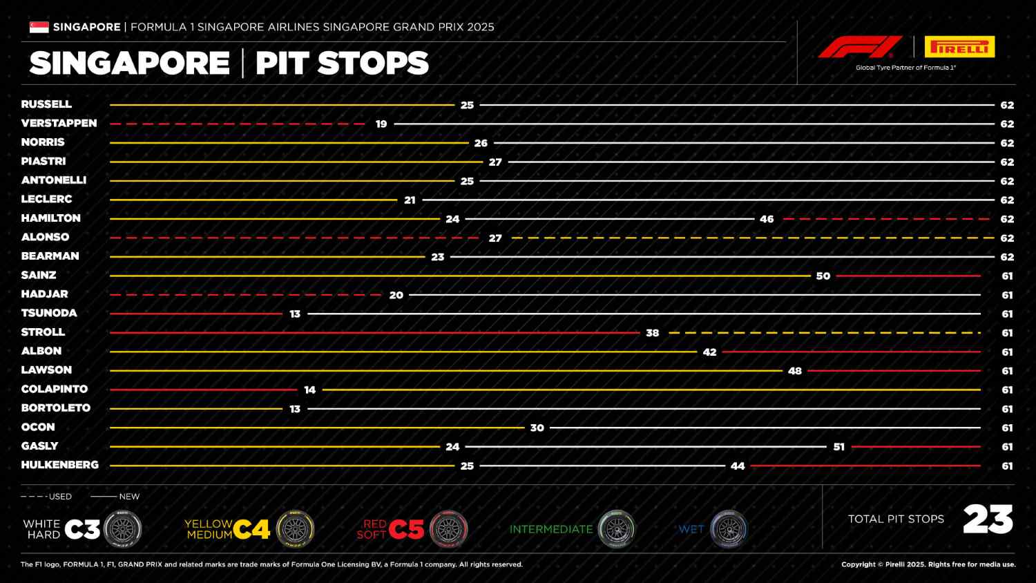 Mario Isola, Diretor da Pirelli Motorsport, fez questão de dar os parabéns a Russell e à McLaren pelo desempenho em Singapura. Salientou também como esta geração de monolugares “atingiu um nível de sofisticação tal que as ultrapassagens se tornaram extremamente difíceis, sobretudo num circuito como o de Singapura, pela sua configuração”. Sublinhou ainda a “mestria cada vez maior das equipas e dos pilotos na gestão dos pneus”, com stints longuíssimos em médios (50 voltas) e macios (38 voltas). “Mesmo que optássemos por um hipotético C8, não teria alterado significativamente o desenrolar da prova”, admitiu.