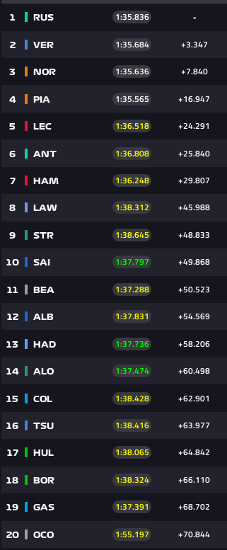 George Russell está no comando das operações a meio da corrida, com quatro segundos de vantagem para Max Verstappen. Mas se no primeiro stint Russell conseguiu uma distância de 9 segundos para o #1 da Red Bull, Verstappen está a conseguiu encurtar as distâncias para Russell.